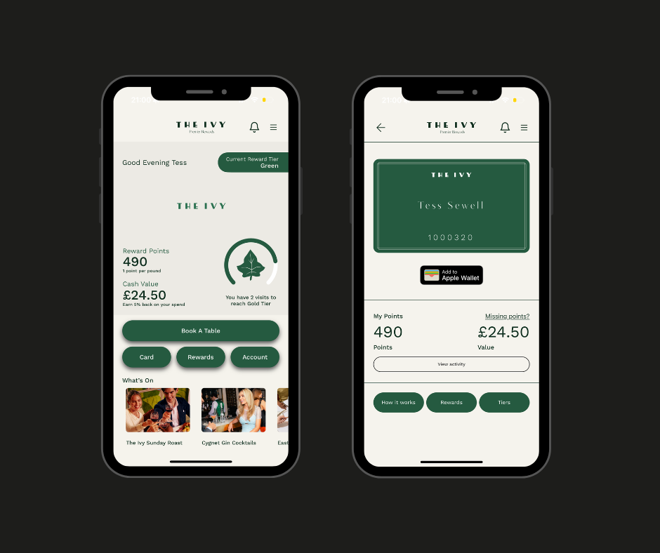 We embarked on designing and developing a multi-tiered bespoke loyalty program with Comtrex and Open Table integrations. Customers enter as ‘Green’ tier, earning points and progressing through tiers to unlock exclusive rewards while redeeming cash value points against each penny spent. Upon reaching their tenth visit to The Ivy Collection, and after scanning their digital card from within the app, customers are automatically promoted to the coveted ‘Gold’ tier. The homepage displays an engaging, gamified tier progress feature, making this advancement visible and exciting.